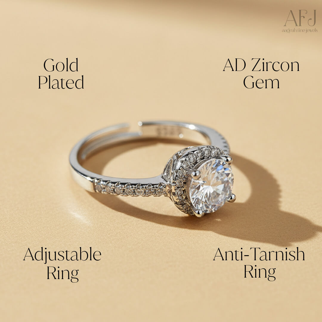 Experience timeless elegance with the Celeste Halo Silver Ring, a stunning circular solitaire ring crafted for modern women who love minimalist luxury. Designed with high-quality silver plating, this ring features a brilliant-cut American Diamond, surrounded by a delicate halo of shimmering stones. The contemporary band adds a sleek, modern touch, making it perfect for office wear, casual outings, or evening glam.