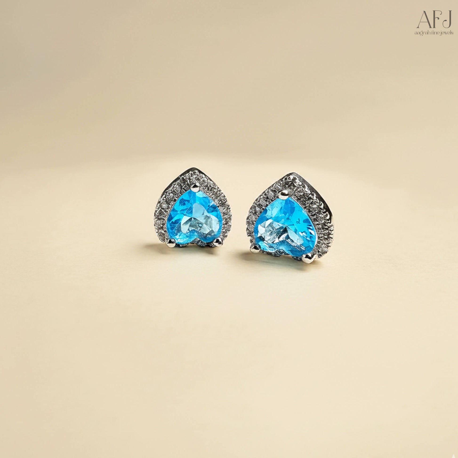 Radiate grace and sophistication with The Azure Heart Stud Earrings. Designed to sparkle with every movement, these stunning earrings feature a mesmerizing crushed ice cut blue American Diamond at the center, encased in a delicate halo of shimmering stones for a luxurious brilliance.
